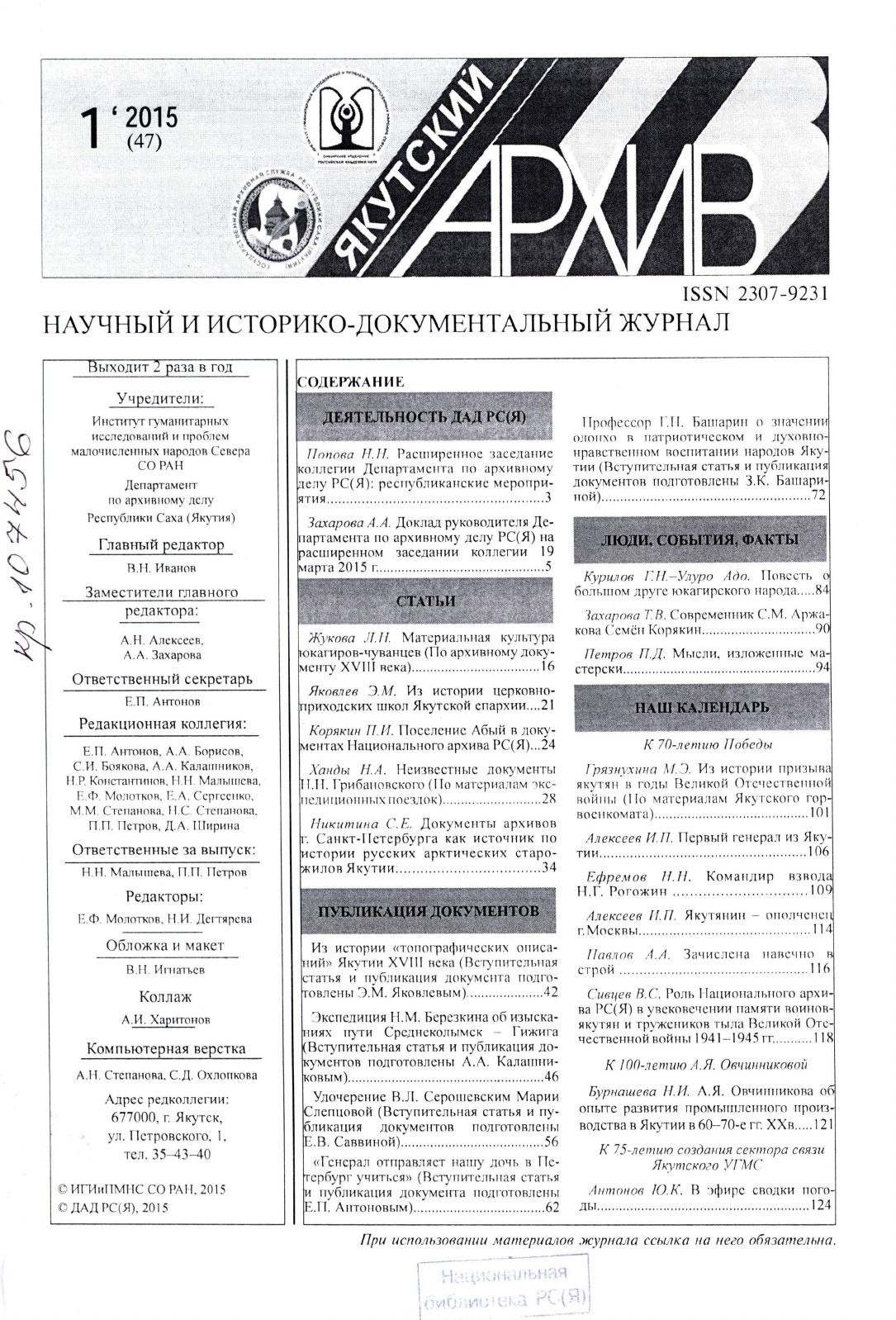 - Периодические издания Якутии (конец XIX – XXI вв.) > Журналы > Якутский архив > 2015,