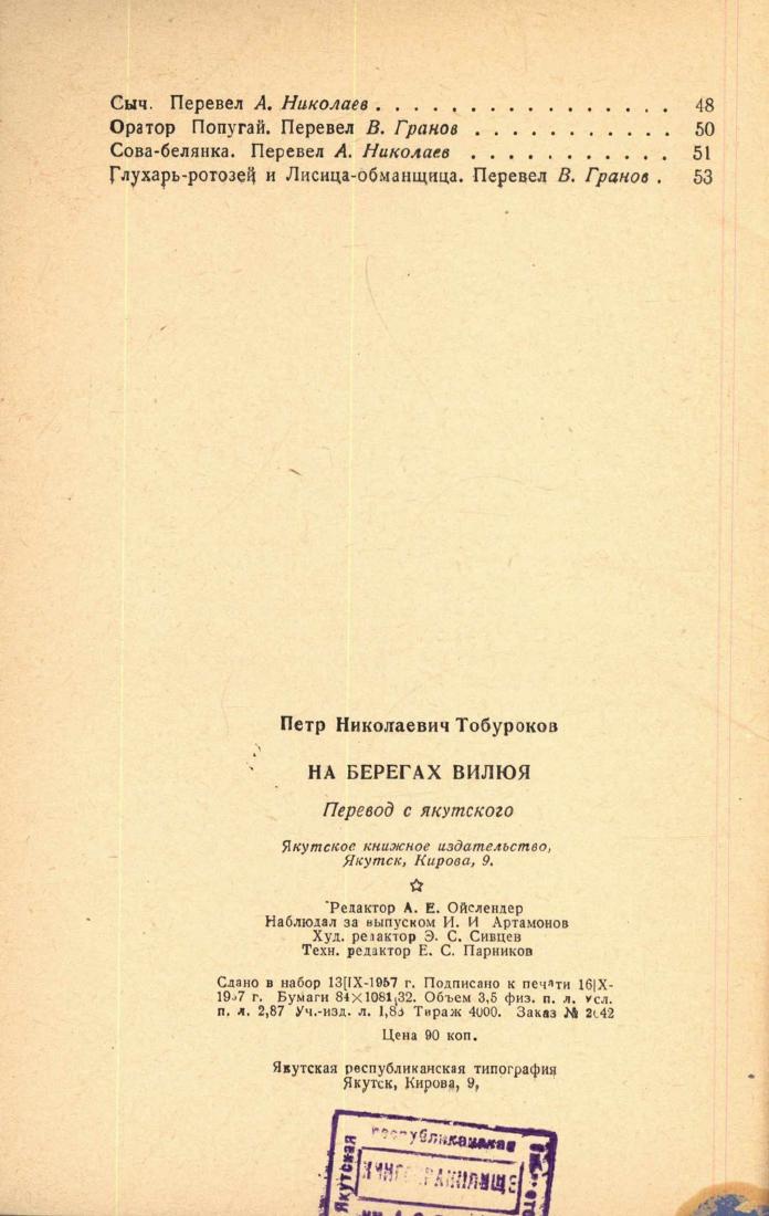 На берегах Вилюя : [стихи] : перевод с якутского / Петр Тобуроков. - Якутск : Книжное издательство, 1957. - 53, [3] с.