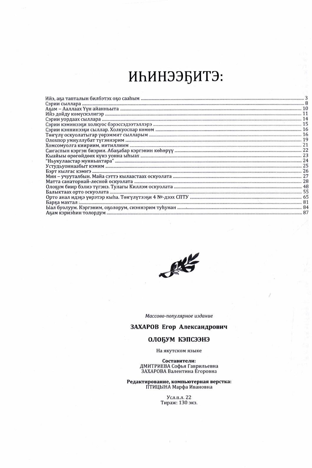 Олоҕум кэпсээнэ : [ахтыылар] / Захаров Егор Александрович ; [хомуйан оҥордулар: С. Г. Дмитриева, В. Е. Захарова]. - Дьокуускай : [и. с.], 2018. - 87, [1] с., [44] л. ил., портр.