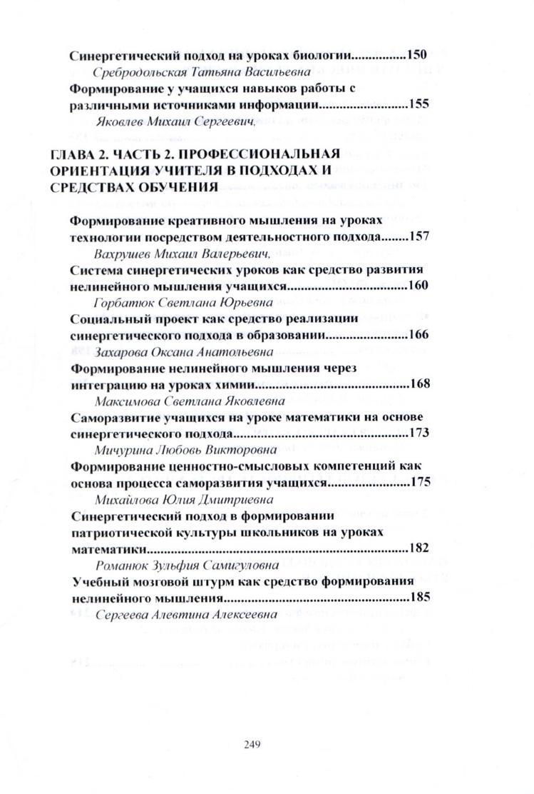 Данная книга состоит из 3-х глав. В 1-й главе представлены статьи преподавателей ИРОиПК о реформе системы образования, об ориентации учителя на овладение профессиональными компетентностями в соответствии с Профстандартом, который будет действовать с 2017 года. Во 2-й главе - статьи научного руководителя проекта Степановой Т. И., Кеошенгольц Б. А. как научно-теоретическое обоснование использования синергетики в педагогике, также статьи учителей СОШ N15 об инновационной деятельности. В 3-й главе представлены работы учащихся как демонстрация результативности труда учителя