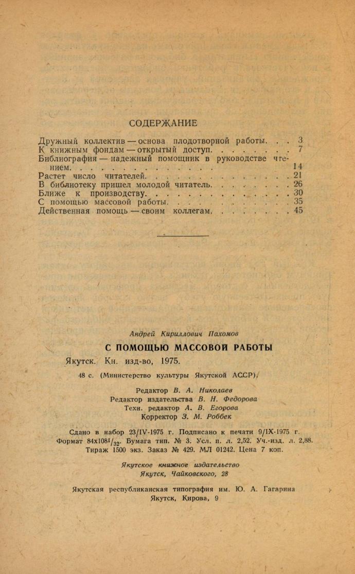 С помощью массовой работы : Опыт работы Якутской городской библиотеки имени В. Г. Белинского / А. К. Пахомов ; Министерство культуры Якутской АССР. - Якутск : Книжное издательство, 1975. - 48 с.