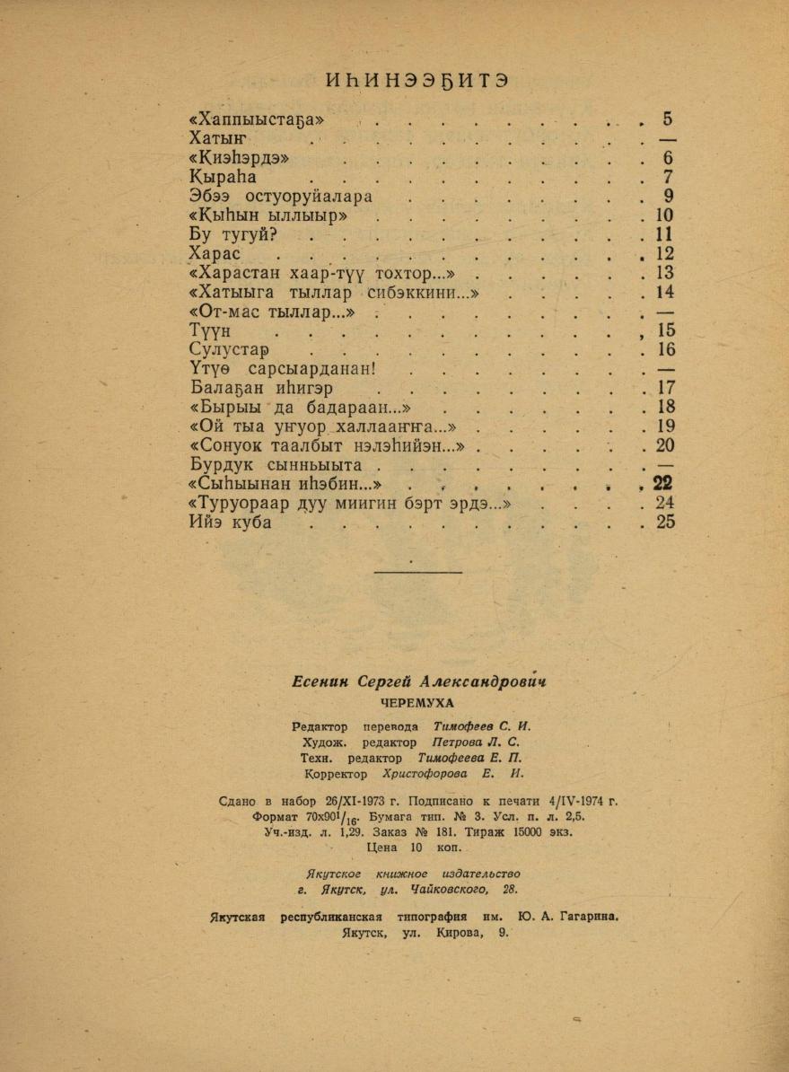 Харас : хоһооннор : [кыра саастаах оскуола оҕолоругар] / С. А. Есенин ; Петр Тобуруокап тылбааһа. - Якутскай : Кинигэ издательствота, 1974. - 32 с.