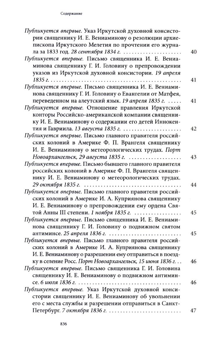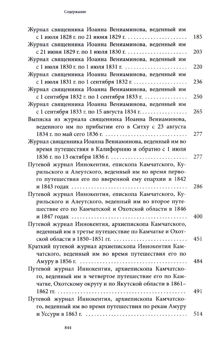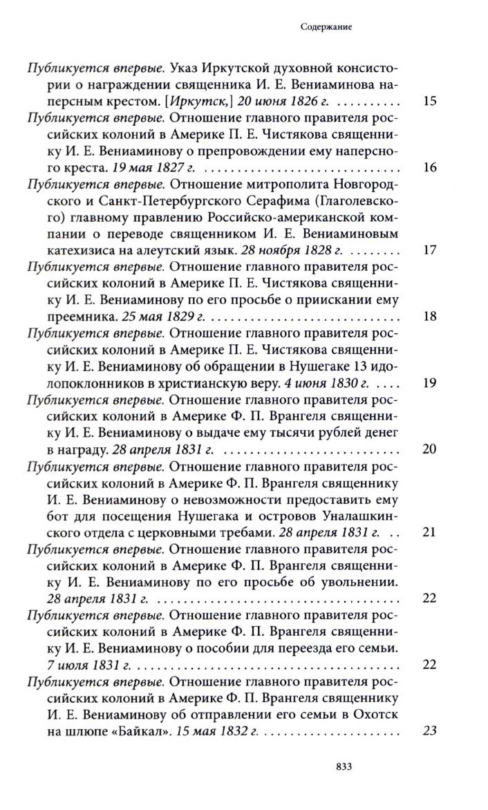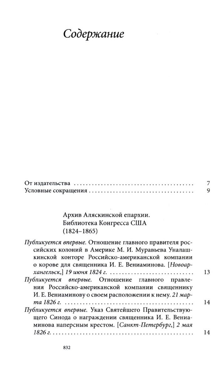 Собрание сочинений и писем : в 7 т. / свт. Иннокентий Московский, просветитель Америки и Сибири ; [редкол. : еп. Якутский и Ленский Роман (Лукин) и др.]. - Москва : Изд-во Московской патриархии Русской Православной Церкви, 2013-. - 22 см см. ISBN 978-5-88017-328-0 (общ.) : 500 р. - 1000 экз. Т. 7: Архив Аляскинской епархии (1824-1865) ; Путевые журналы (1823-1867) ; История репрессий и реабилитации членов семьи Вениаминовых (1930-1989). - 2015. - 845, [1] с., [1] л. цв. ил.