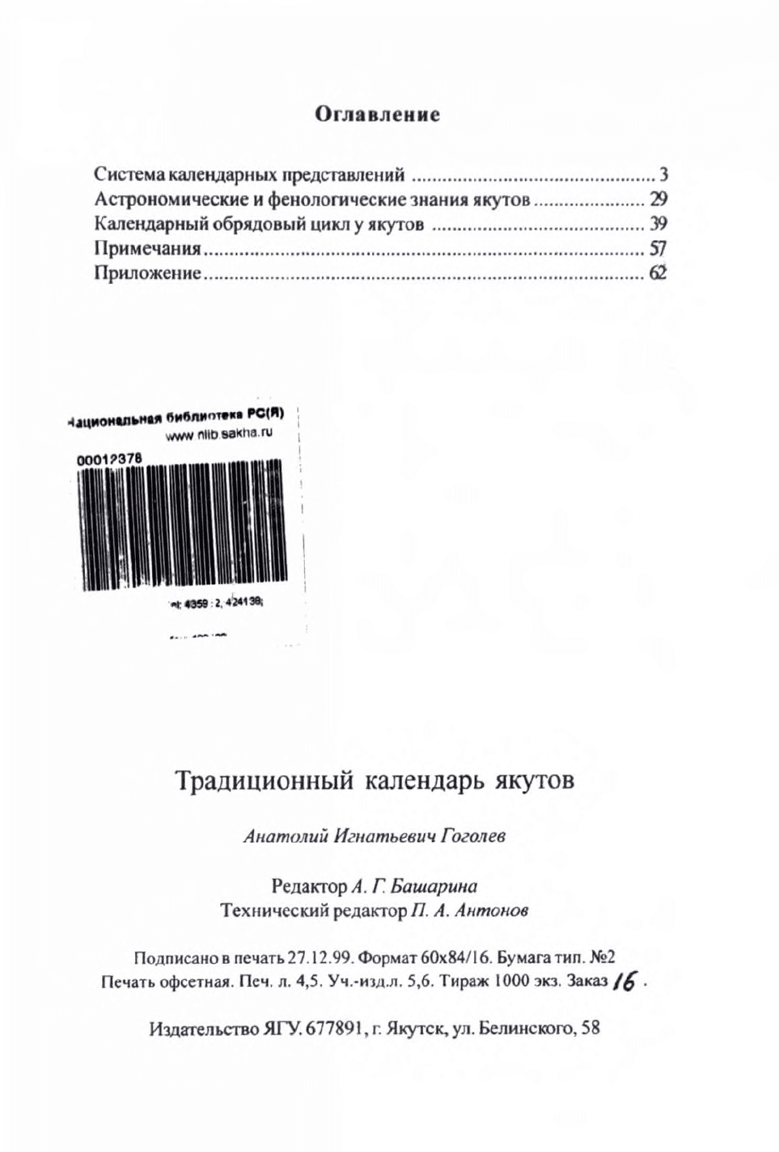 Традиционный календарь якутов / А. И. Гоголев ; художники: А. Гоголев, А. Гоголев ; Министерство по делам народов и федеративным отношениям Республики Саха (Якутия). - Якутск : Издательство ЯГУ, 1999. - 71 с.