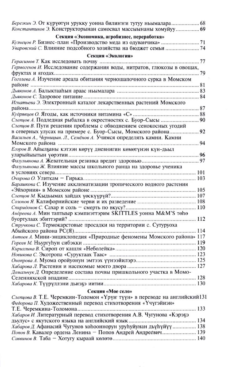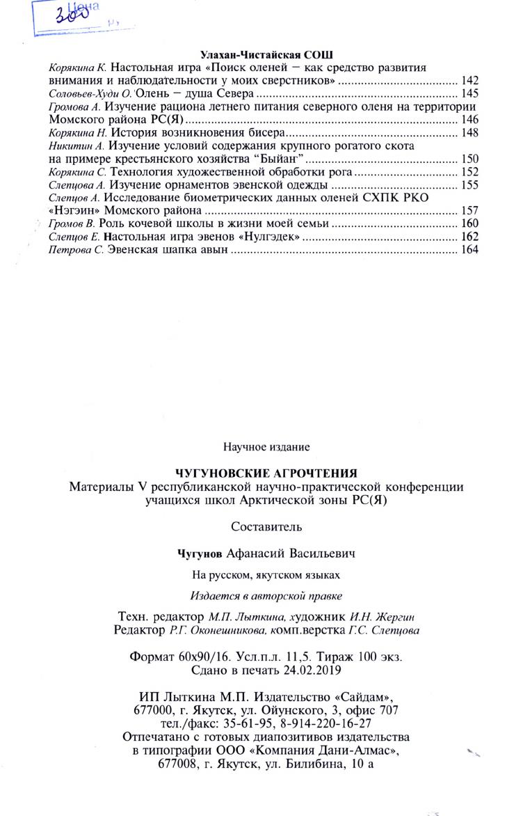 Чугуновские агрочтения : материалы V республиканской научно-практической конференции учащихся школ Арктической зоны Республики Саха (Якутия) / составитель, ответственный редактор, автор предисловия А. В. Чугунов, доктор сельскохозяйственных наук, профессор ; ответственные за выпуск: В. А. Фазульянова, Р. Е. Старкова, А. П. Петрова, кандидат педагогических наук, доцент [и др.]. - Якутск : Сайдам, 2019. - 164, [4] с., [8] л. ил.