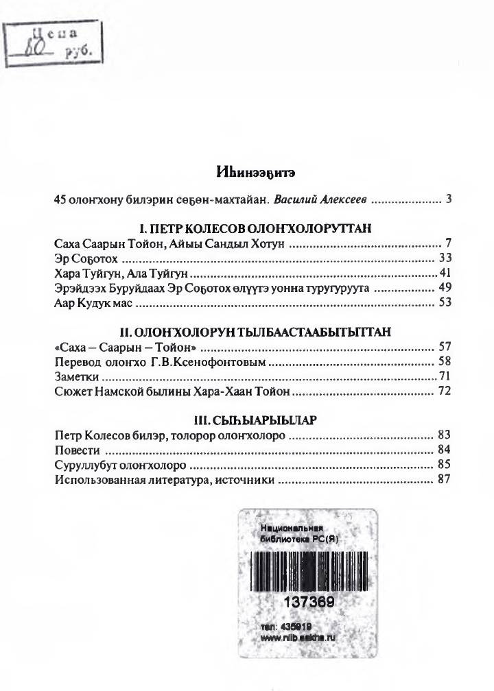В книгу вошли отрывки из олонхо Петра Колесова, жителя Атамайского наслега, знавшего 45 олонхо, которые записал и перевел на русский язык известный этнограф, историк Г. В. Ксенофонтов