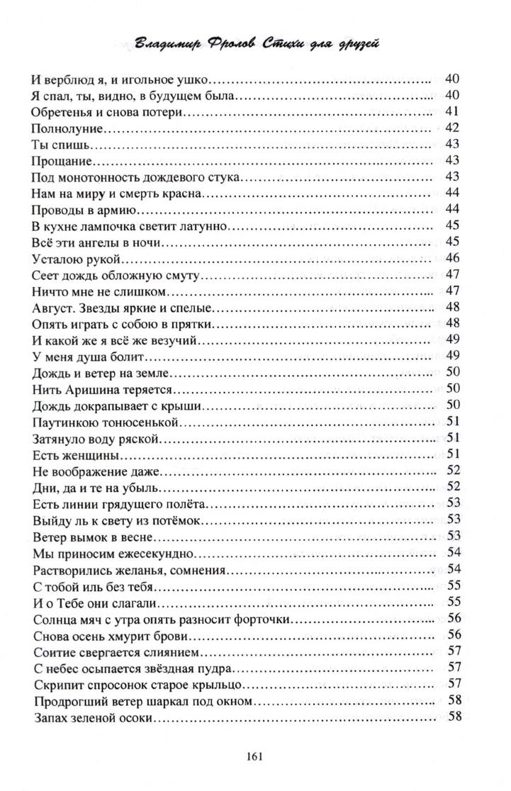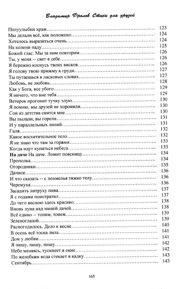 Владимир Фролов - разный. Как и его стихи. С флером изысканности поэтических салонов серебрянного века и романтичным, бесшабашным (как и безбашенным) гусарством. Противоречивый. Глубокая философичность мыслей, стремление заглянуть вглубь, внутрь себя, граничит с трогательной детскостью... Прикоснитесь к богатой палитре самовыражения Поэта. Прикоснитесь к его и своей душе. Этот сборник, "Стихи для друзей", настоящий подарок друзьям Поэзии