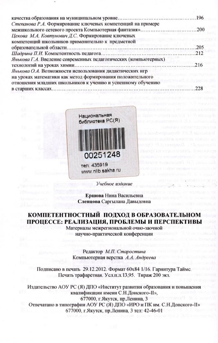 Компетентностный подход в образовательном процессе: реализация, проблемы и перспективы : материалы межрегиональной очно-заочной научно-практической конференции, г. Якутск, 24 июня 2012 г. / [составители: кандидат педагогических наук Н. В. Ершова, С. Д. Слепцова]. - Якутск : Издательство ИРОиПК, 2012. - 239, [1] с.