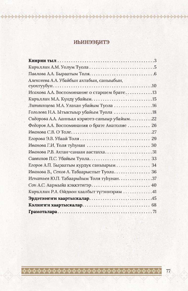 Суоппар уолбут Туола : [ахтыылар] / хомуйан оҥордо А. А. Сидорова. - Дьокуускай : Ю. А. Гагарин аатынан өрөспүүбүлүкэтээҕи типография, 2022. - 1 файл (77 с. ; 28 Мб)