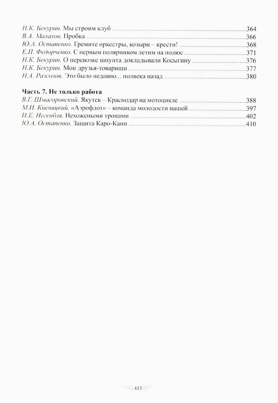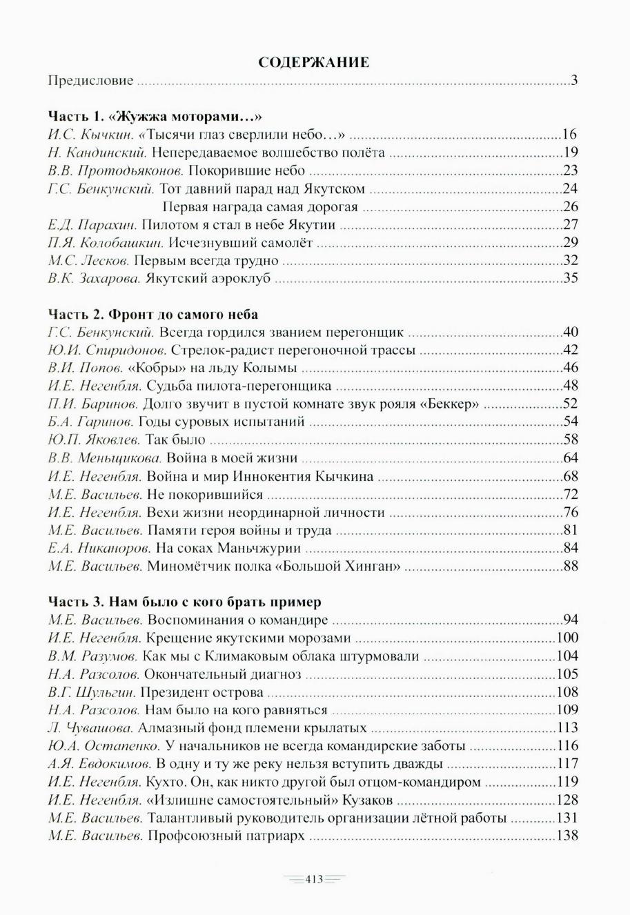 Книга содержит воспоминания авиаторов Якутии, а также статьи и очерки, посвященные деятельности видных руководителей воздушного транспорта РС (Я) и простых тружеников, отдавших лучшие годы жизни работе в небе или на земле по обслуживанию самолетов и вертолетов в экстремальных условиях нашего Северного Края. Так как книга выходит в канун юбилея Великой Победы, то значительная часть материалов посвящена ветеранам Великой Отечественной войны и перегоночной трассы Аляска - Сибирь, составлявших не одно десятилетие золотой фонд отрасли. Книга иллюстрирована фотографиями, многие из них публикуются впервые