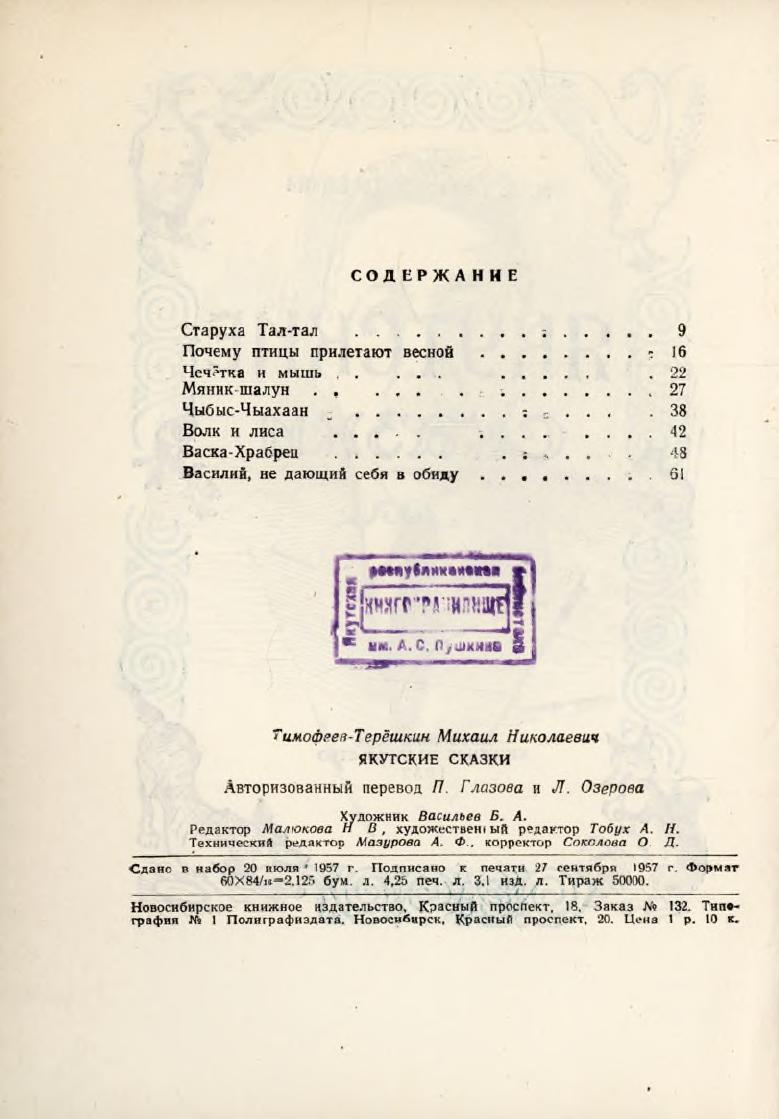 Якутские сказки / М. Н. Тимофеев-Терешкин ; перевод с якутского: П. Глазова и Л. Озерова. - Новосибирск : Книжное издательство, 1957. - 66, [2] с.