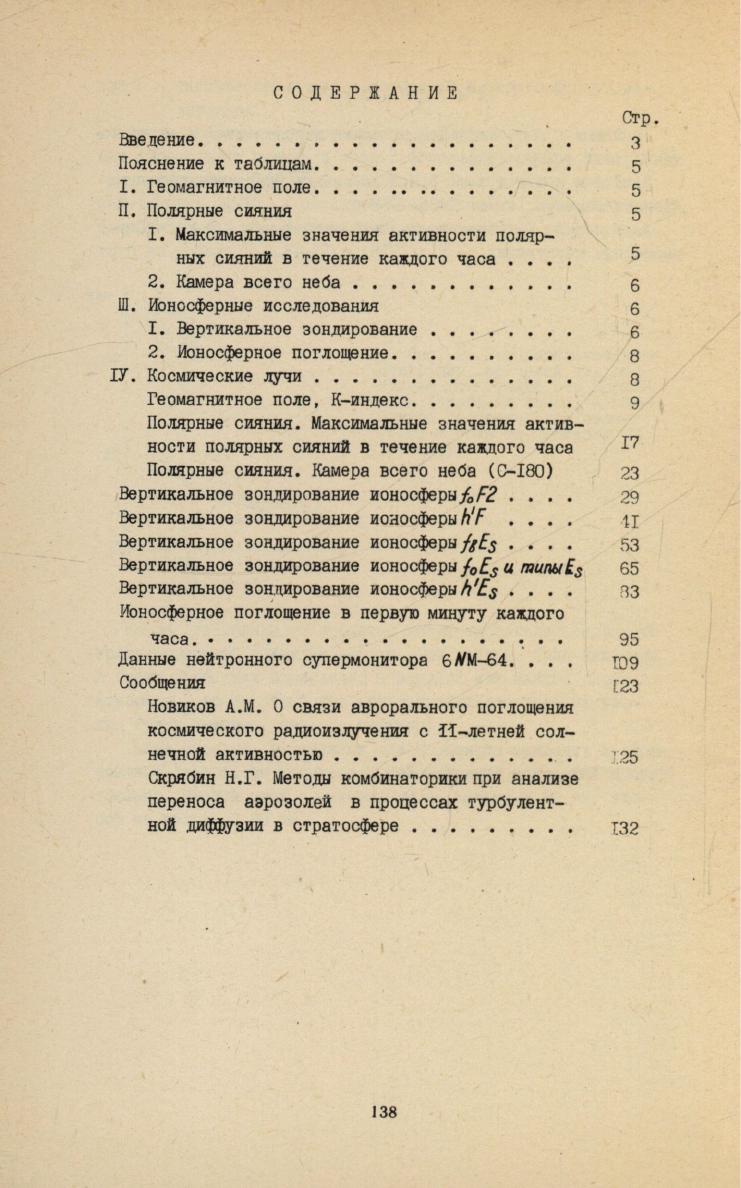 Приведены данные о геомагнитном поле (К-индекс), об активности полярных сияний (максимальные яркости сияний), а также о работе фотографической камеры всего неба, об ионосфере (характеристики F2 и Еs-слоев и величины поглощения космического радиошума на частоте 32 МГц) и об интенсивности нейтронной компоненты космических лучей