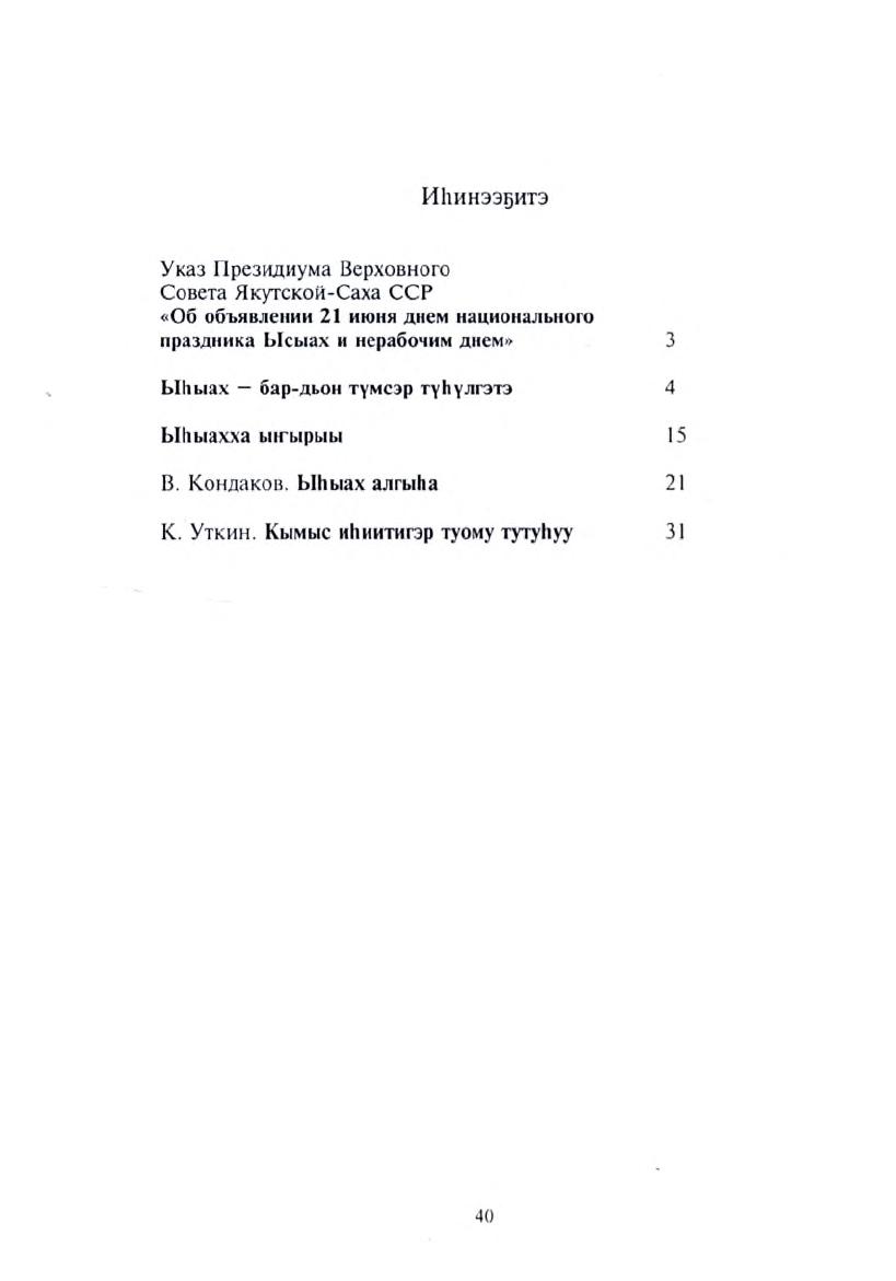 Ыһыах - норуот бырааһынньыга / Саха Республикатын Ытык Сүбэтэ, Саха Республикатын чөл олох иһин хамсааһыны государство өйөөһүҥҥэ ведомстволар икки ардыларынааҕы ситэриилээх дирекцията. - Дьокуускай : [и. с.], 2001. - 40 с.