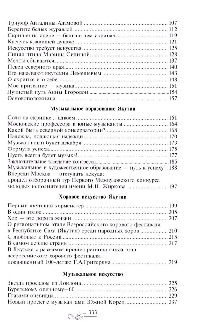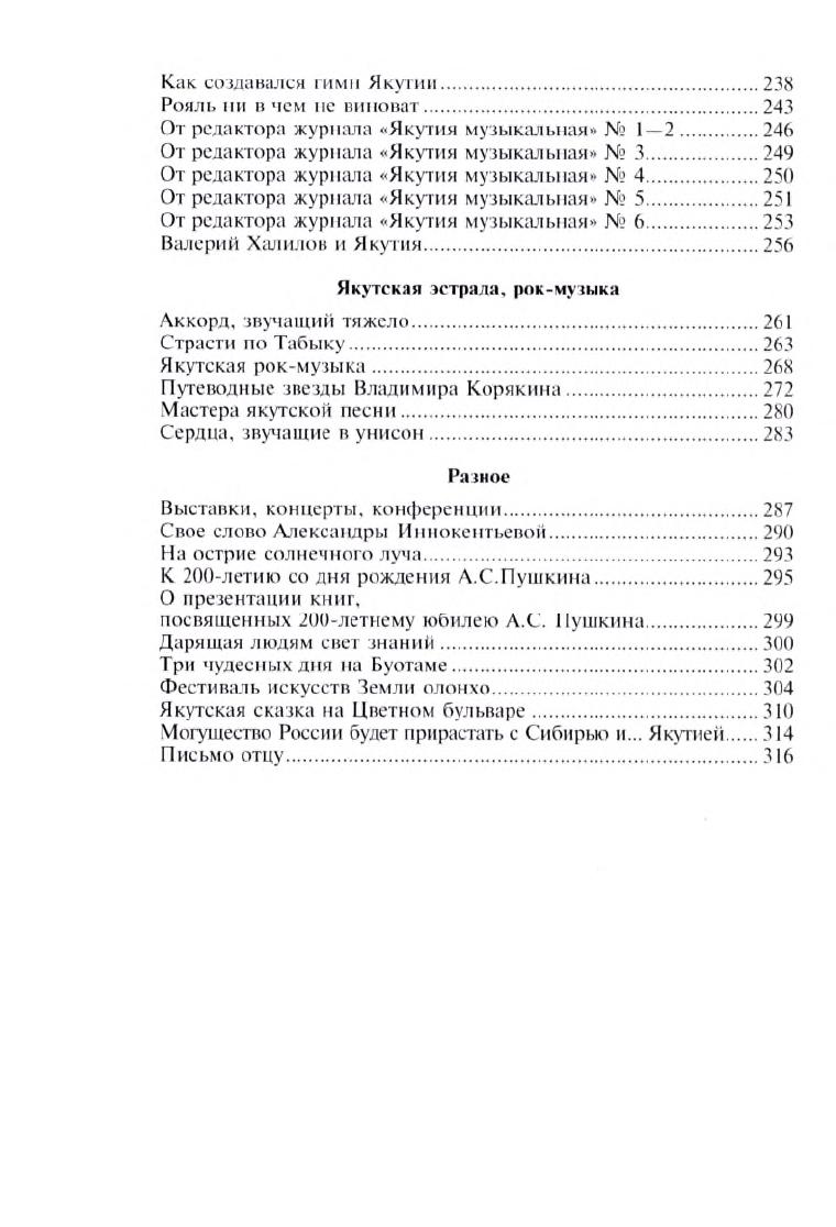 В сборнике впервые представлены публицистические материалы музыковеда, кандидата искусствоведения, заслуженного деятеля искусств Республики Саха (Якутии) Т. В. Павловой-Борисовой, посвященные вопросам развития музыкальной культуры и искусства Республики Саха (Якутия), музыкальному образованию, деятельности якутских композиторов, музыкальным деятелям республики, этнической, хоровой музыке, современным музыкальным направлениям - эстраде, рок-музыке и т.д. Широкая палитра публицистических жанров от газетных заметок и интервью до развернутых статей, авторских очерков, творческих портретов и эссе дают возможность получить представление о событиях музыкальной культуры республики и ее видных деятелях на рубеже XX-XXI вв.