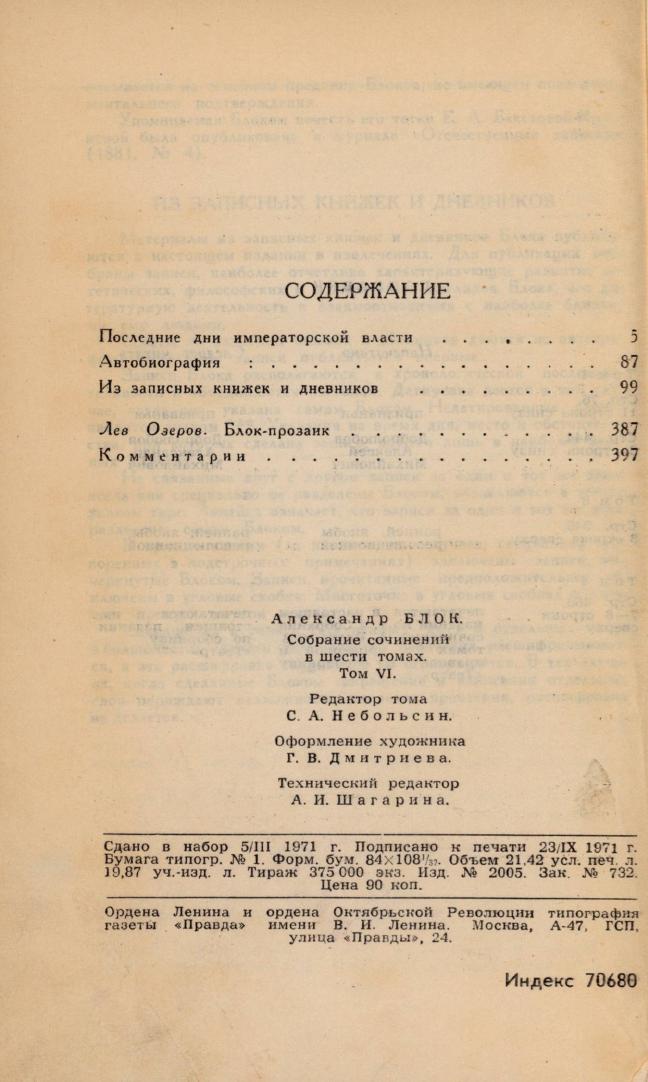 Собрание сочинений : в 6 т. / Александр Блок. - Москва : Библиотека "Огонек" : Правда, 1971. - 20 см. - (Библиотека отечественной классики). - 375000 экз. Т. 6. - 397, [3] c., [4] отд. л. ил. Содерж.