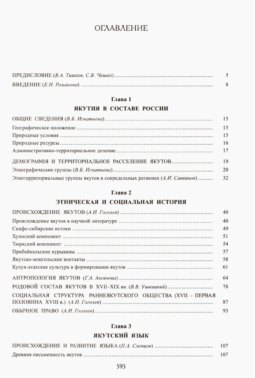 В исследовании большое внимание уделяется происхождению, археологии, антропологии, ран ней этнической и социальной истории якутского народа, дается демографическая характеристика якутов, описаны этнографические и этнотерриториальные группы за пределами республики. Все сторонне рассмотрены вопросы развития хозяйства, материальной и духовной культуры. Впервые представлено подробное описание ремесел и культуры жизнеобеспечения, важное место занимает реконструкция архаичного календаря и календарных праздников. В тесной взаимосвязи рассматриваются мифология, ранние культы, шаманизм и православие. Разделы, посвященные образованию и профессиональной национальной культуре, написаны на основе междисциплинарных методик: историко-культурной, искусствоведческой, литературоведческой, культурологической. Также при водятся современные материалы по этнокультурным и этнополитическим проблемам.