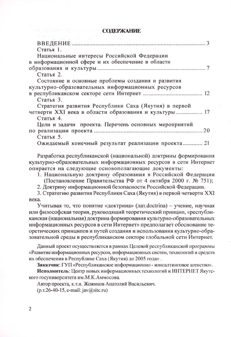 Республиканская (национальная) доктрина формирования информационных культурно-образовательных ресурсов в сети Интернет / А. В. Жожиков ; Целевая республиканская программа "Развитие информационных ресурсов, информационных систем, технологий и средств их обеспечения в Республике Саха (Якутия) до 2005 г.", Развитие региональных информационных ресурсов. - Якутск : [б. и.], 2002. - 24 с.