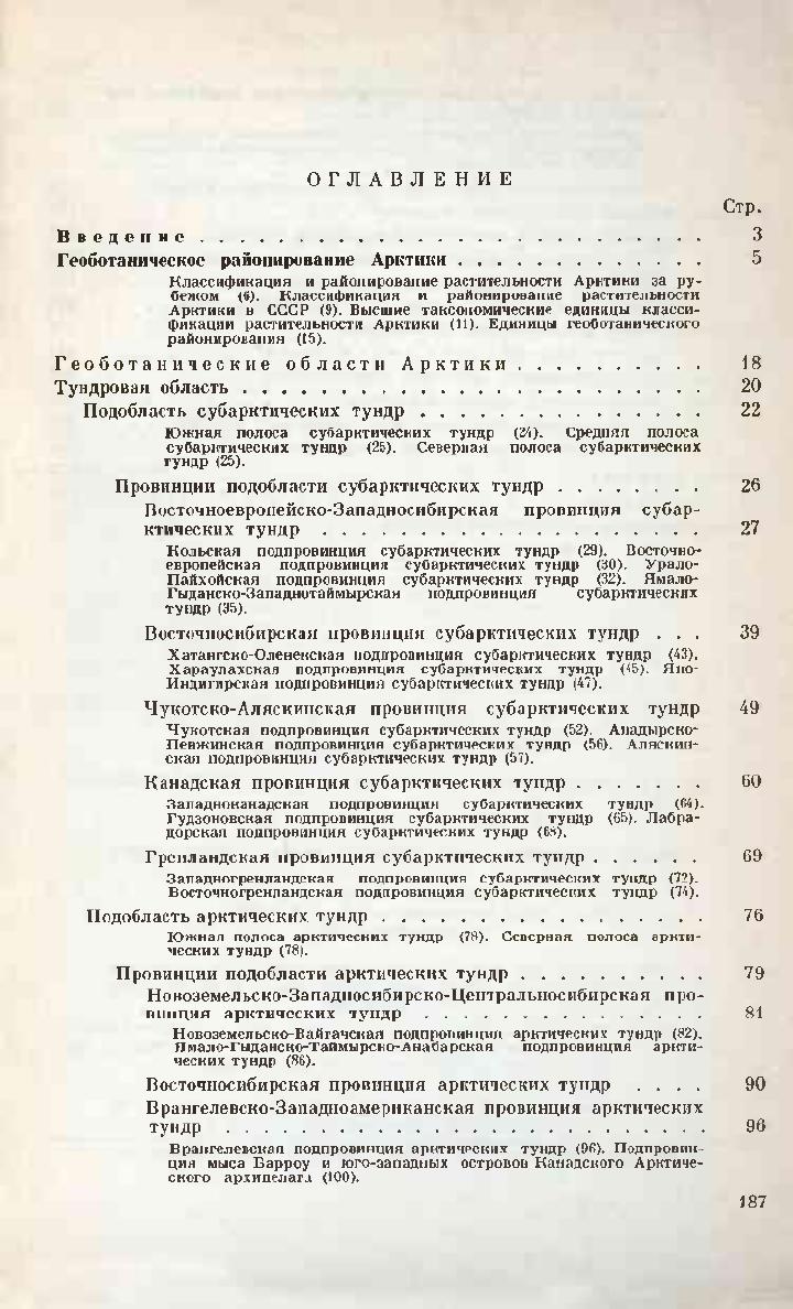 Излагаются принципы и результаты геоботанического районирования советских и зарубежных территорий Арктики (к северу от полярного предела лесов) и Антарктики (к югу от линии антарктической конвергенции). В Арктике выделено две области: тундровая и полярных пустынь, в пределах тундровой области две подобласти — арктических и субарктических тундр. Каждая из них разделяется на геоботанические провинции и подпровинции, а в ряде случаев и округа. В Антарктике различаются две области: субантарктических травяных подушечников и антарктическйх полярных пустынь. Для каждого из выделенных регионов приведен очерк растительности и указана библиография