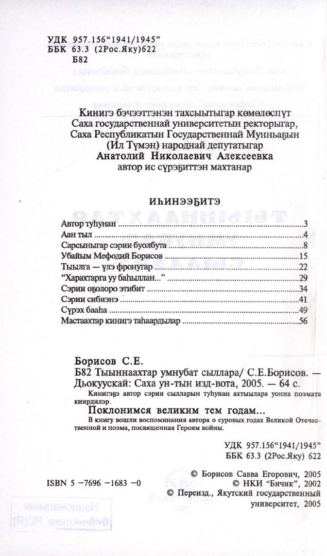 Тыыннаахтар умнубат сыллара / С. Е. Борисов ; Саха Республикатын культуратын уонна духовнай сайдыытын министерствота, Саха Республикатын национальнай библиотеката, М. К. Аммосов аатынан Саха государственнай университета, "Сайдам санаа" общественнай академия. - Переизд. - Дьокуускай : Издательство ЯГУ, 2005. - 60, [4] с.