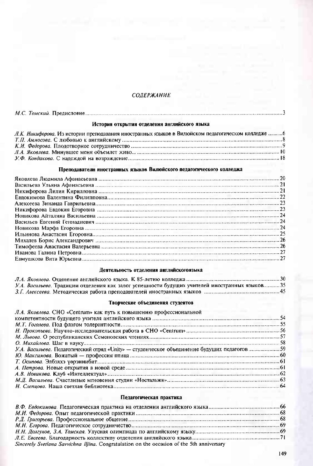 Книга раскрывает еще одну страницу в 90-летней истории Вилюйского педагогического коллежда им. Н. Г. Чернышевского. Отделение английского языка, основанное в 1999 году, прошло славный путь становления, развития и обновления и подготовило более трехсот квалифицированных специалистов-учителей английского, французкого и корейского языков