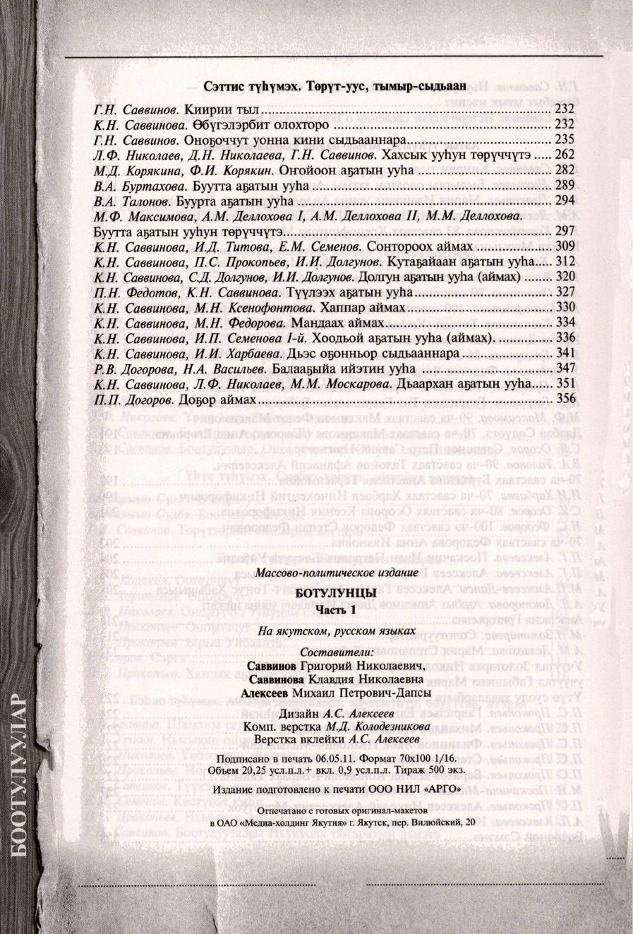 Боотулуулар / [хомуйан оҥордулар: Г. Н. Саввинов, К. Н. Саввинова, М. П. Алексеев-Дапсы ; редколлегия: Г. Н. Саввинов, М. П. Алексеев-Дапсы]. - Дьокуускай : Медиа-холдинг "Якутия", 2011 - Ч. 1. - 359, [1] с., [8] л. ил., портр.