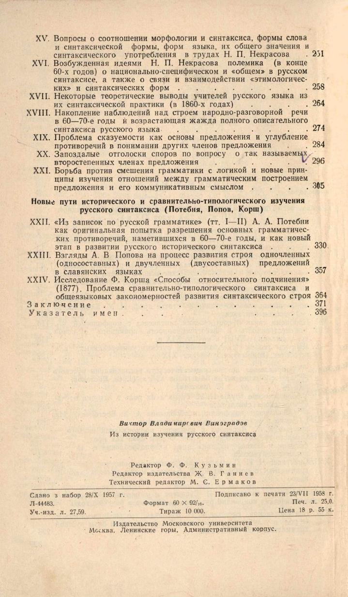 Из истории изучения русского синтаксиса : (от Ломоносова до Потебни и Фортунатова) / В. В. Виноградов. - Москва : Издательство МГУ, 1958. - 399, [1] с.