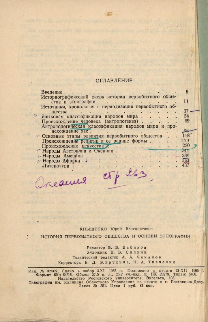 История первобытного общества и основы этнографии : учебное пособие / Ю. В. Кнышенко ; ответственный редактор А. П. Пронштейн. - Ростов-на-Дону : Издательство Ростовского университета, 1965. - 440 с.