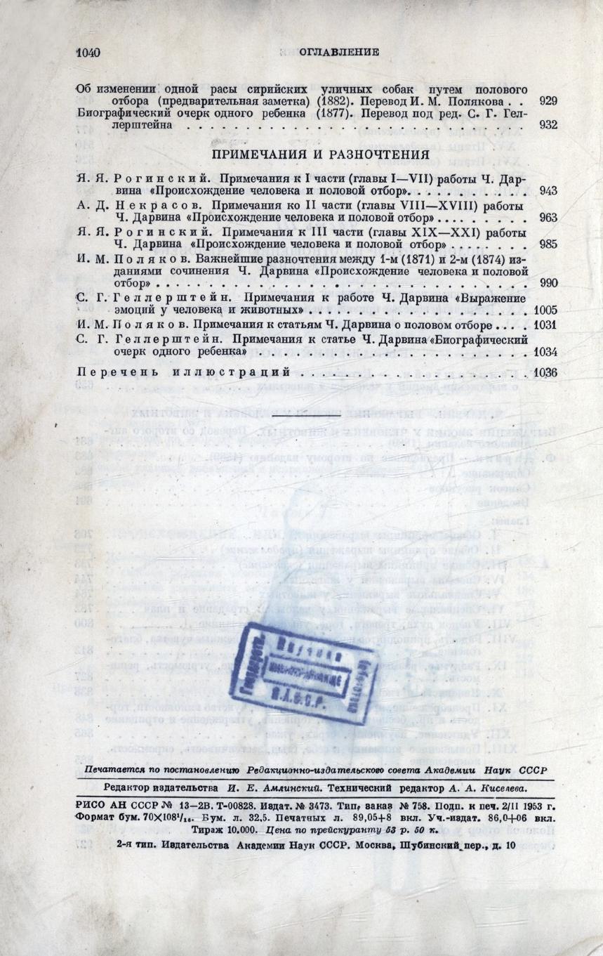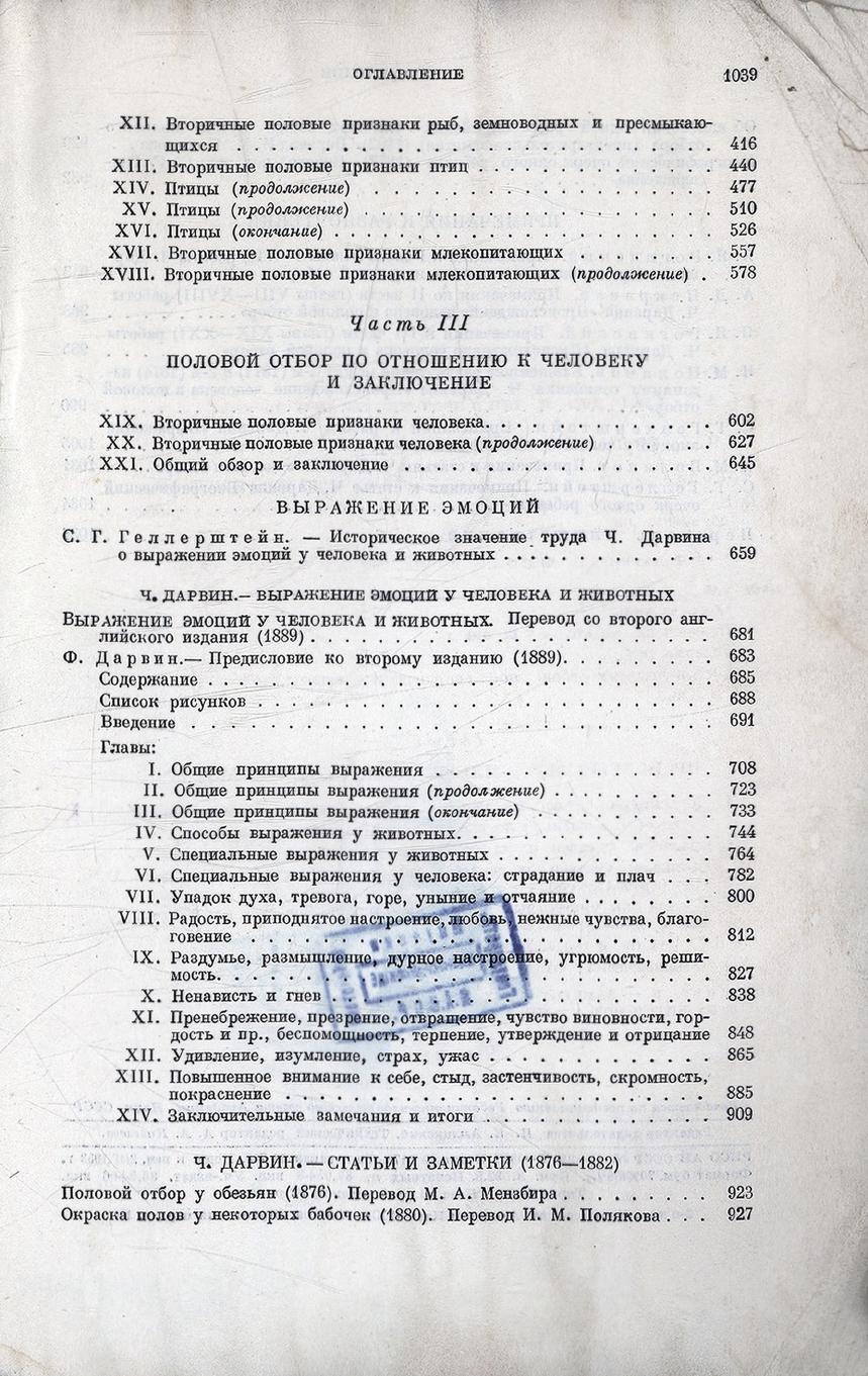 Сочинения / Чарлз Дарвин ; под общей редакцией Л. С. Берга, Н. И. Вавилова, П. И. Валескална [и др.]. - Москва ; Ленинград : Государственное издательство биологической и медицинской литературы, 1935- . - 21 см. Т. 5: Происхождение человека и половой отбор ; Выражение эмоций у человека и животных / под ред. акад. Е. Н. Павловского. - М., 1953. - 1040 с., 8 л. ил.