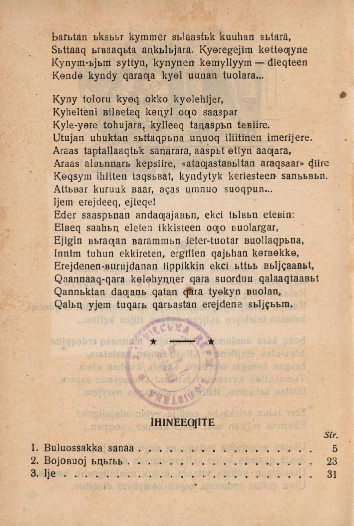 Хоһооннор / Амма Аччыгыйа. - Москуба : Судаарыстыба үөрэх пэдэгиэгикэ кинигэтин пэчээтэ, 1936. - 31, [1] с.
