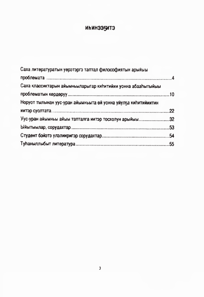 В пособии раскрывается новый подход к разработке этического, нравственно-духовного содержания произведений якутской литературы. В нем осуществляется анализ специфики нравственно-духовного развития личности с позиций новой философии современного образования