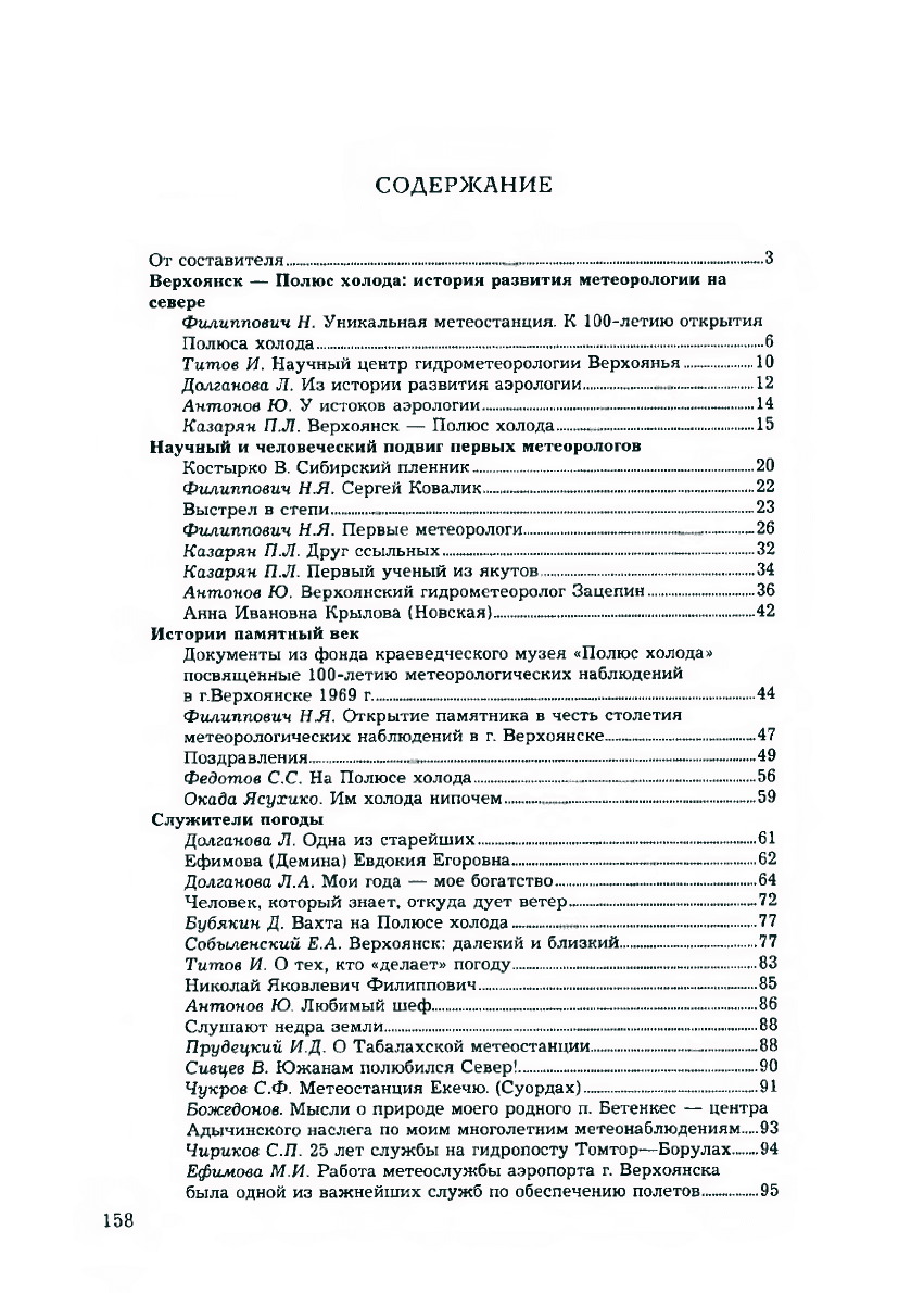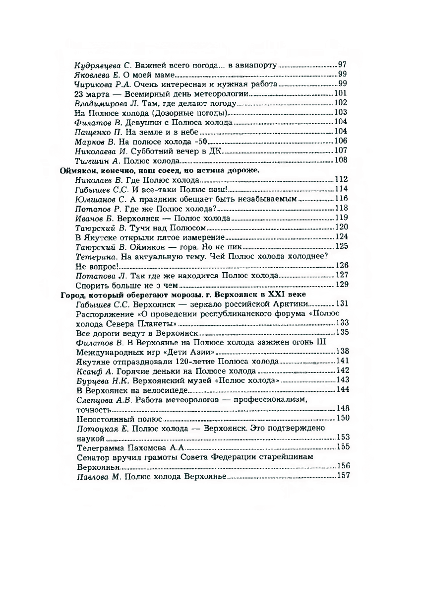 Книга приурочена к 125-летию регистрации в г. Верхоянске абсолютного минимума температуры на планете. В сборник включены исторические статьи, интересные факты, публиковавшиеся в различных изданиях и газетах, воспоминания работников метеостанции города Верхоянска. Книга адресована широкому кругу читателей