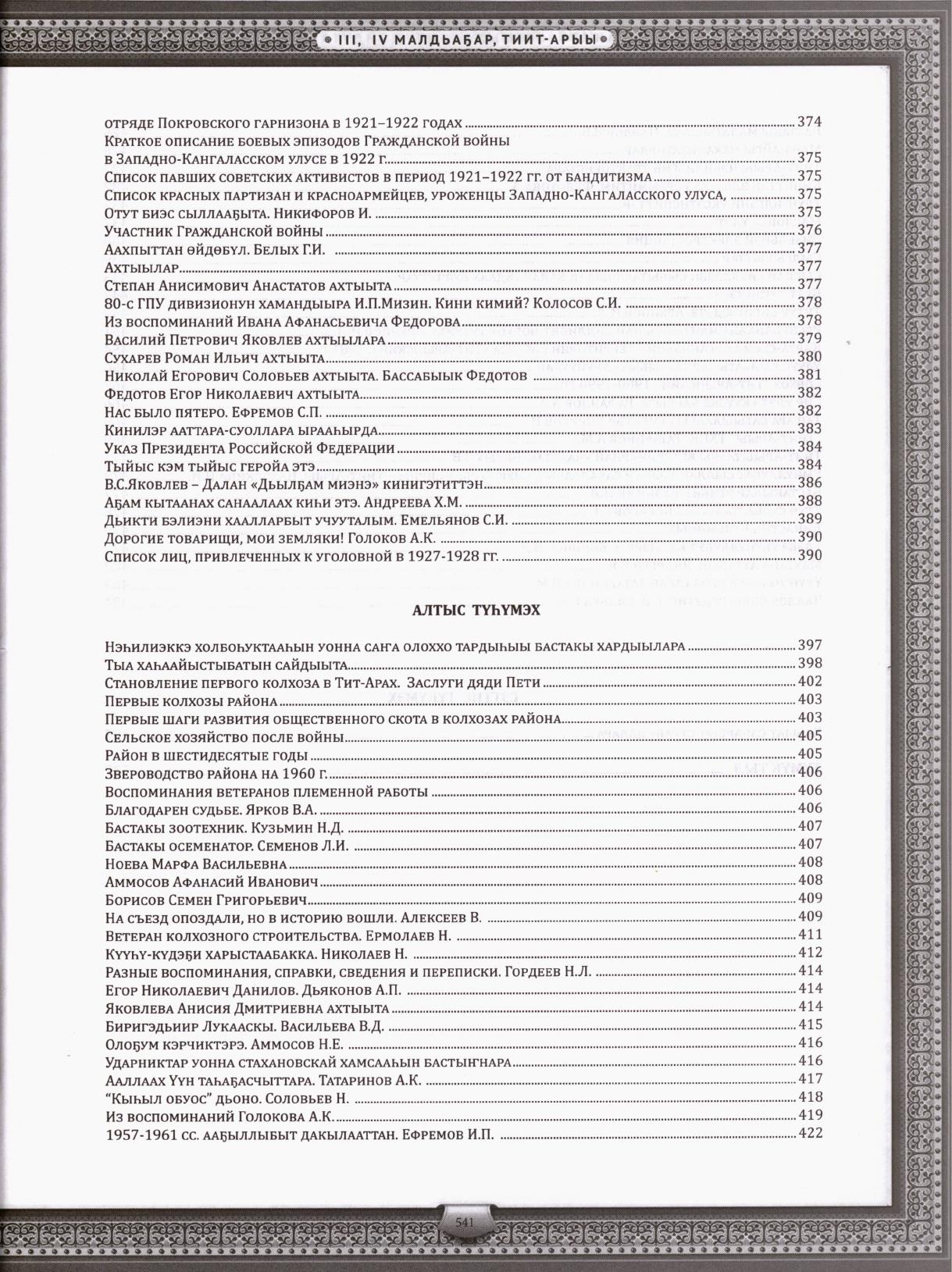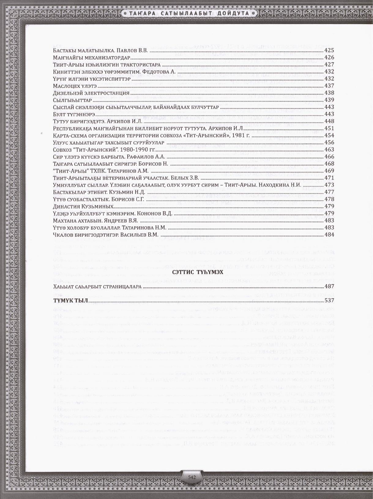 Таҥара сатыылаабыт дойдута : III, IV Малдьаҕар, Тиит-Арыы : [1795-1990 сс.] / Хаҥалас улууһа "Тиит Арыы нэһилиэгэ" МТ ; [хомуйан оҥордулар: Г. И. Белых, Т. С. Степанова, Р. С. Степанова уо. д. а. ; редкол.: С. Д. Соловьев, Г. И. Белых, Т. С. Степанова уо.д.а. ; аан тыл авт. Г. Д. Лукин]. - Дьокуускай : Кытыл, 2018. - 542 с., [10] л. ил.