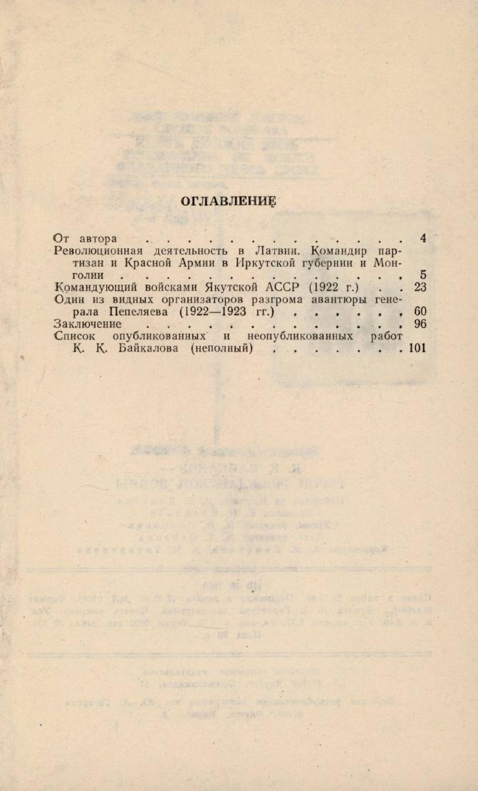 В книге освещается революционная деятельность К. К. Байкалова в Латвии, его роль как командира отряда партизан в Иркутской губернии и красного отряда в Монголии в 1918-1921 гг. Показана его деятельность как командующего войсками Якутской АССР в 1922-1923 гг. Книга рассчитана на массового читателя и переиздается к столетию со дня ео рождения