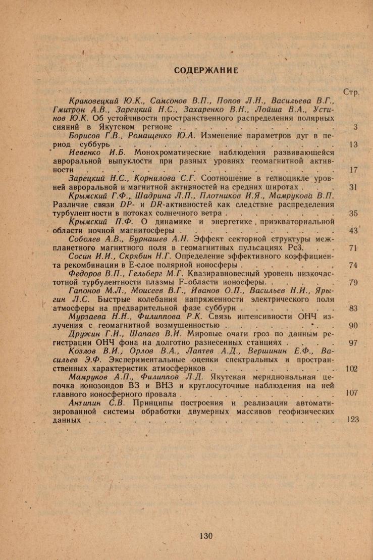 Приведены результаты экспериментальных и теоретических исследований, связанных с актуальными проблемами физики ионосферы и магнитосферы. Основу сборника составляют исследования полярных сияний, т. е. эффектов, обусловленных высыпанием электронов малых энергий в ионосфере. Ряд работ посвящен исследованию геомагнитной активности и короткопериодных колебаний электромагнитного поля. Рассмотрены вопросы энергетики магнитосферы Земли и эффекты взаимосвязи солнечной активности и регулярного шумового фона ОНЧ-излучения.