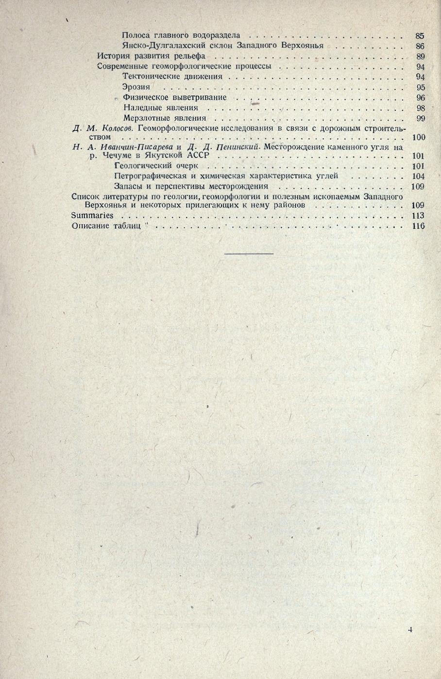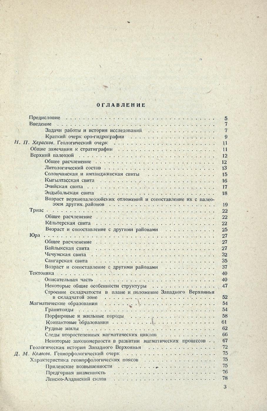 Геология и геоморфология Западного Верхоянья = Geology and geomorphology of the Western part of the Verkhoyanye region : с приложением статьи Н. А. Иванчин-Писаревой и Д. Д. Пенинского / Н. П. Хересков и Д. М. Колосов ; [предисловие, ответственный редактор Н. Шатский]. - Москва ; Ленинград : ГОНТИ : Главная редакция горно-топливной и геолого-разведочной литературы, 1938. - 116 с., 14 вкл. л. ил., схем., карт.