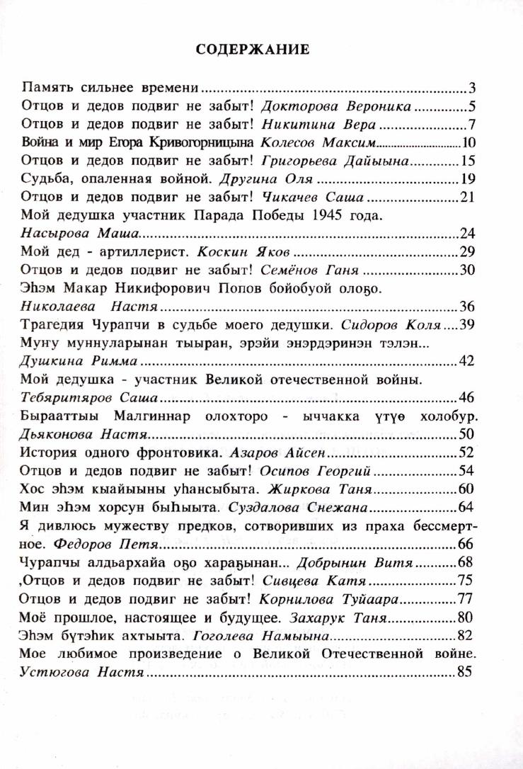Республиканский конкурс творческих работ школьников "Отцов и дедов подвиг не забыт!" / Центр для детей и юношества Национальной библиотеки Республики Саха (Якутия), Комитет по делам семьи и детства при Президенте Республики Саха (Якутия) ; составитель В. С. Рожина ; редактор А. Д. Яковлева ; ответственный за выпуск А. Н. Иванова. - Якутск : РИЦ НБ РС (Я) изд-вота, 2010. - 85, [1] с.