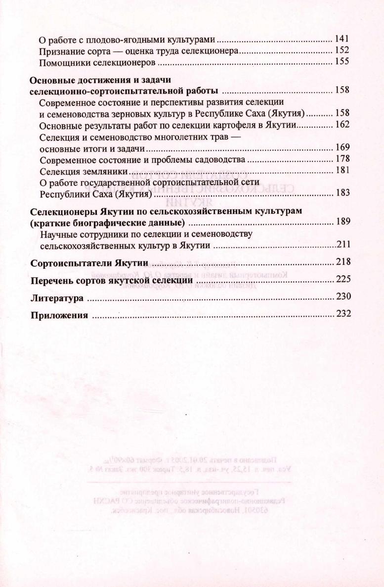 В книге приведены биографические материалы о селекционерах и сортоиспытателях, работавших и работающих в настоящее время над созданием сортов сельскохозяйственных культур для суровых природно-климатических условий Якутии (за период с 1927 по 2003 г.). Прослежены пути выведения новых сортов от поиска и создания исходного материала до регистрации и внедрения в производство