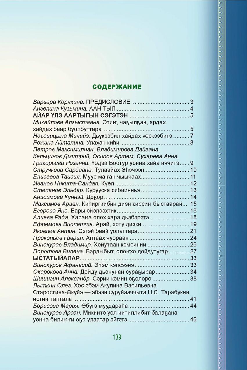 В книгу вошли художественные произведения, статьи школьников на якутском, юкагирском, долганском, чукотском, эвенском, эвенкийском языках. Дети разных возрастов в первых писательских опытах затронули сокровенные темы о культурной традиции, этнографии, жизни в тайге, фольклоре и мифах, переосмысленных согласно современному миру. Также в статьях раскрывают яркие образы людей, которые внесли вклад в развитие культурного наследия родного края