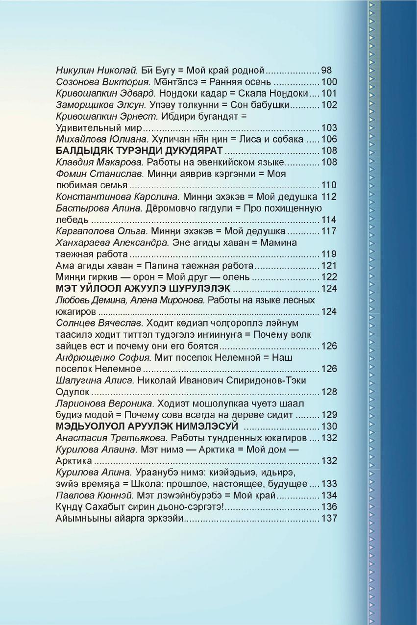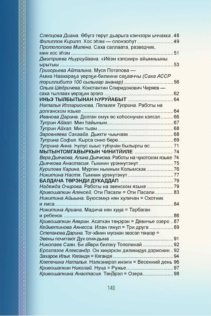 Сочиняю на родном языке : произведения коренных народов Якутии / Информационно-исследовательский центр нематериального культурного наследия народа саха, Союз писателей Республики Саха (Якутия), Национальная библиотека Республики Саха (Якутия) ; составитель А. А. Кузьмина ; художник Е. Д. Садовникова ; редакторы текстов: на якутском языке А. Ф. Саввинова, на долганском языке Н. А. Илларионова, П. И. Туприна [и др. ; автор предисловия Варвара Корякина]. - Якутск : ИЦ НБ РС (Я), 2023. - 1 файл (140, [1] с. ; 53 Мб) : ил., портр.