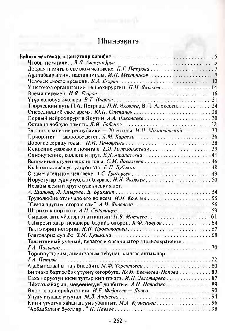 В книгу вошли материалы, статьи о заслуженном враче РСФСР и ЯАССР, депутате Верховного Совета ЯАССР 4-х созывов, проработавшем министром здравоохранения 19 лет П. А. Петрове. В книгу также вошли отрывки из его научных работ и публицистических статей. Книга посвящается 50-летию медицинского образования в Республике Саха (Якутия)