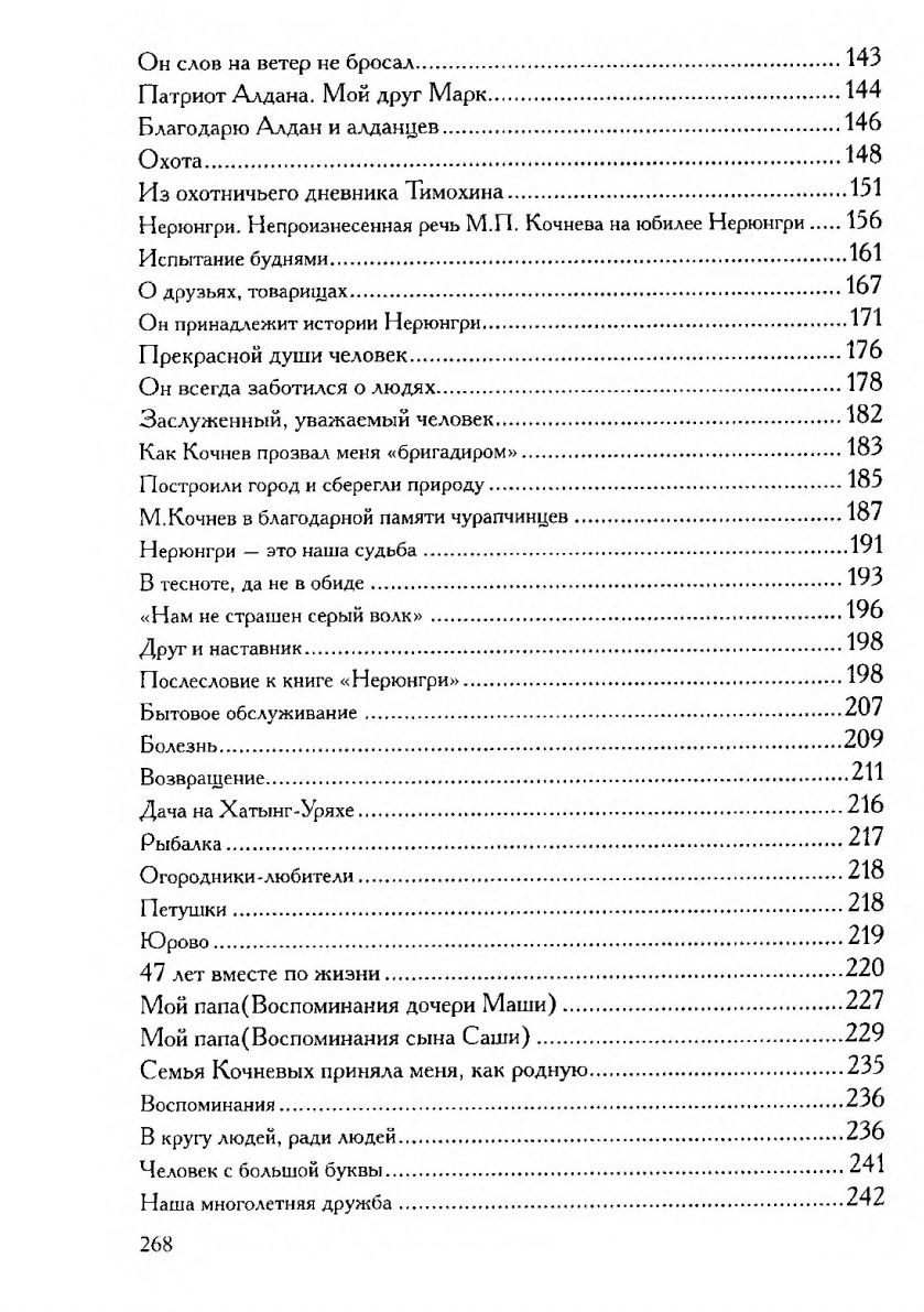 В книгу вошли рукописи М.П. Кочнева и воспоминания его родных и друзей о жизненном пути видного государственного и общественного деятеля, посвятившего свою жизнь служению Якутии и его народу. М.П. Кочнев стоял у истоков формирования Южно-Якутского территориально-производственного комплекса, был одним из основателей города Нерюнгри. М.П. Кочнев - Почетный гражданин Республики Саха (Якутия), города Нерюнгри, Алданского и Мегино-Кангаласского улусов, заслуженный работник народного хозяйства ЯАССР. В книгу вошли фотографии из семейного альбома