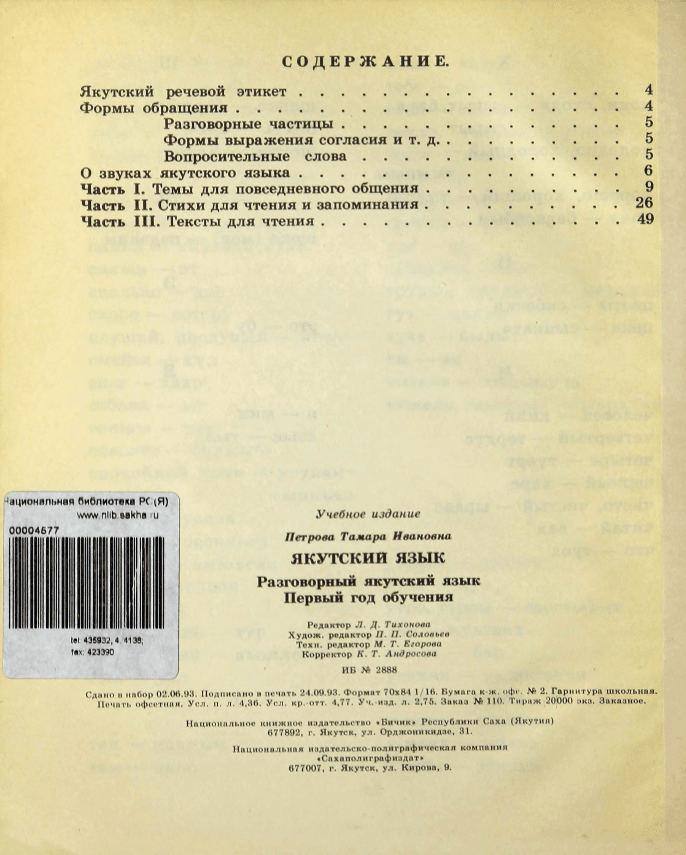 Пособие представляет собой начальный курс разговорного якутского языка. Учебный материал дается в виде маленьких диалогов в типичных ситуациях общения. Много внимания уделяется выработке произносительных навыков. Коротенькие стишки для заучивания и тексты помогут закреплению речевых умений