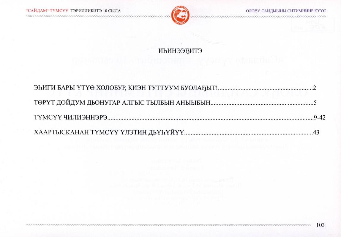 В книге говорится о 10-летней годовщине общественного объединения "Сайдам" Харыялахского наслега Верхневилюйского улуса