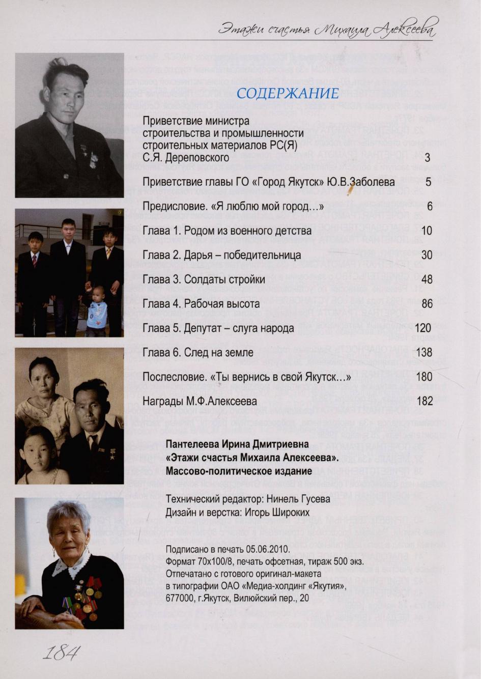 Книга посвящается памяти Героя Социалистического труда, кавалера ордена В. И. Ленина, депутата Верховного Совета ЯАССР трех созывов, пенсионера союзного значения, почетного гражданина г. Якутска, ветерана тыла и труда М. Ф. Алексеева. В книге использованы документы и фотографии, предоставленные Министерством строительства и промышленности строительных материалов РС (Я), ЗАО "Якутпромстрой", О. Г. Карамзиным, М. С. Сергеевым, В. Яковлевым и О. Николаевым