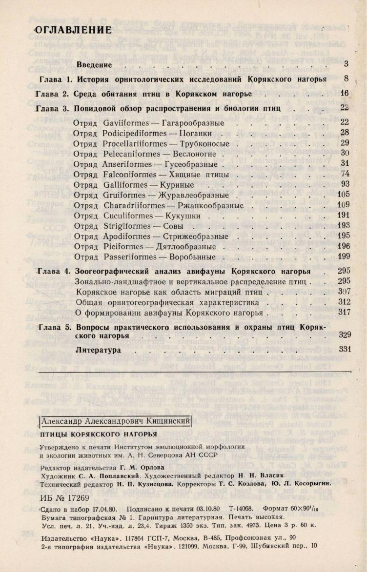В монографии обобщены, в основном на основании результатов экспедиций автора в 1959—1976 гг., материалы о распространении, таксономическом статусе и биологии птиц Корякского нагорья — обширной горной страны в Северо-Восточной Азии, ранее почти не исследованной орнитологами. Описаны пределы распространения отдельных видов и подвидов, характер их пребывания, зональная и поясная приуроченность, связи с типами местообитаний. Изложены данные о сроках периодических явлений, миграциях, размножении и питании птиц, анализируется подвидовая систематика местных популяций. Дается зоогеографическая характеристика авифауны Корякского нагорья и рассматриваются пер спективы охраны и рационального использования ресурсов птиц
