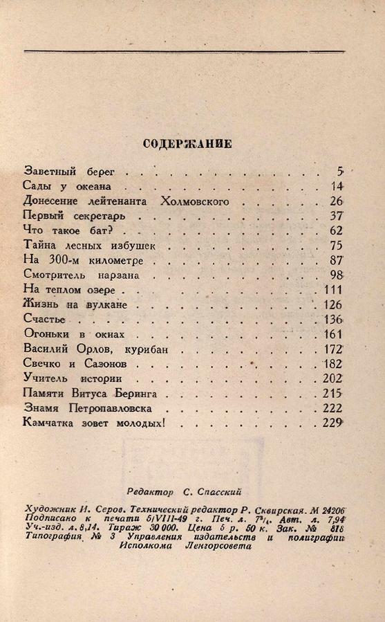 Тихоокеанская весна : [социалистическое строительство на Камчатке] : путевые очерки. - Ленинград : Советский писатель, типография N 3 Управления издательств и полиграфии Исполкома Ленгорсовета, 1949. - 231 с.