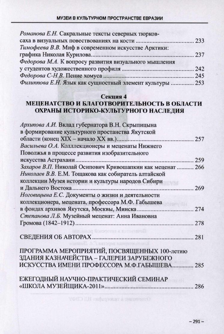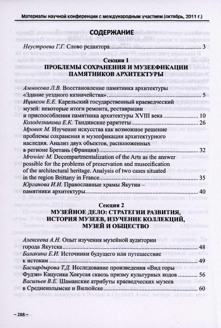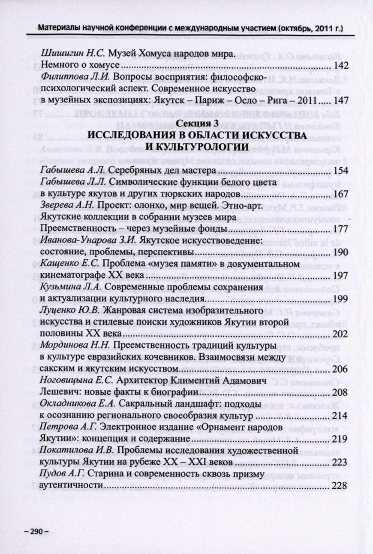 Музеи в культурном пространстве Евразии : материалы научной конференции с международным участием (октябрь, 2011 г.) / [научные редакторы Г. Г. Неустроева, Л. А. Кузьмина] . - Якутск : ИД СВФУ, 2013. - 291, [1] с., [4] л. ил., портр.