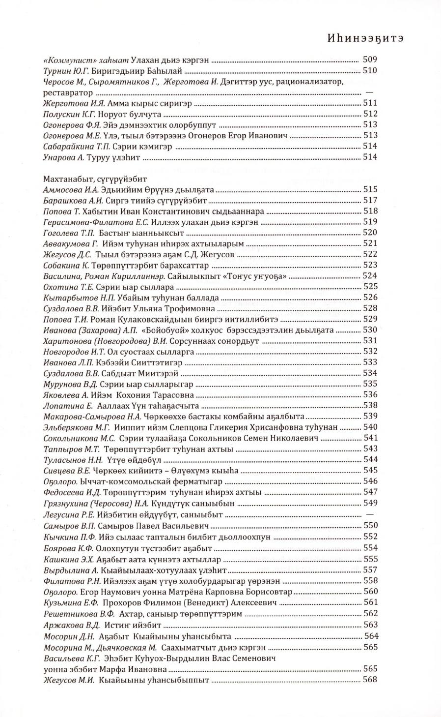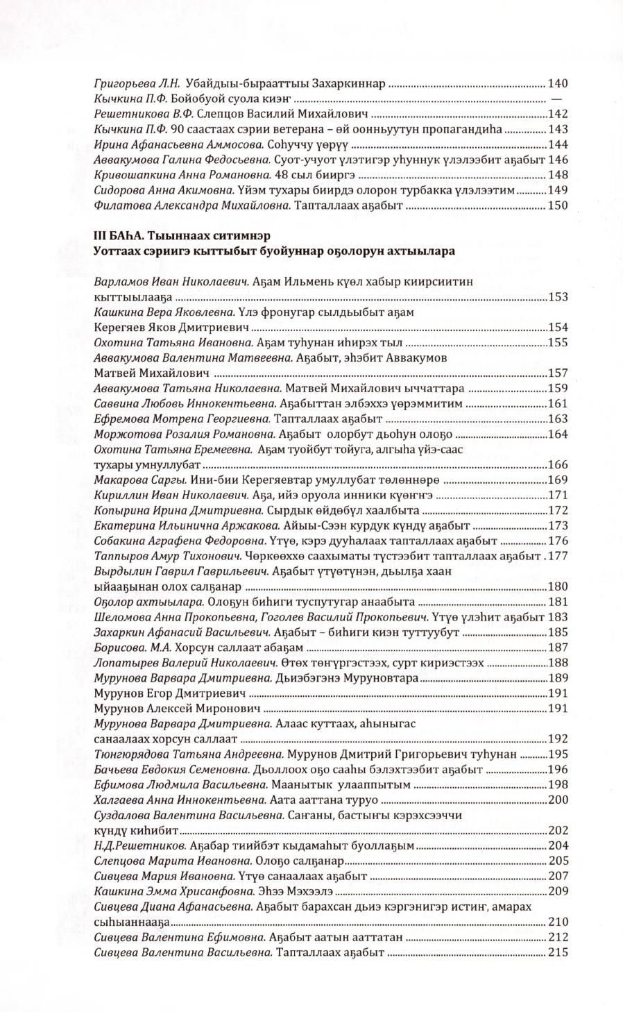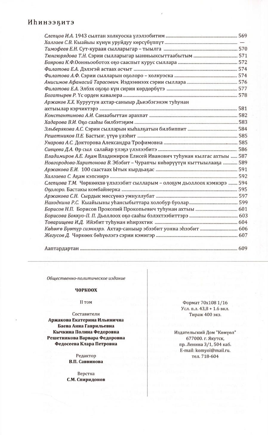 Чөркөөх, Таатта улууһа / [хомуйан оҥордулар, бэчээккэ бэлэмнээтилэр: П. Ф. Кычкина, В. Ф. Решетникова]. - Дьокуускай : Көмүөл, 2013-. - 27 см. История Октябрьского наслега. Т. 2: Аҕа дойду сэриитин сылларыгар / [хомуйан оҥордулар: Е. И. Аржакова, А. Г. Баева, К. П. Федосеева уо.д.а.]. - 2016. - 610, [6] с., [8] л. ил.