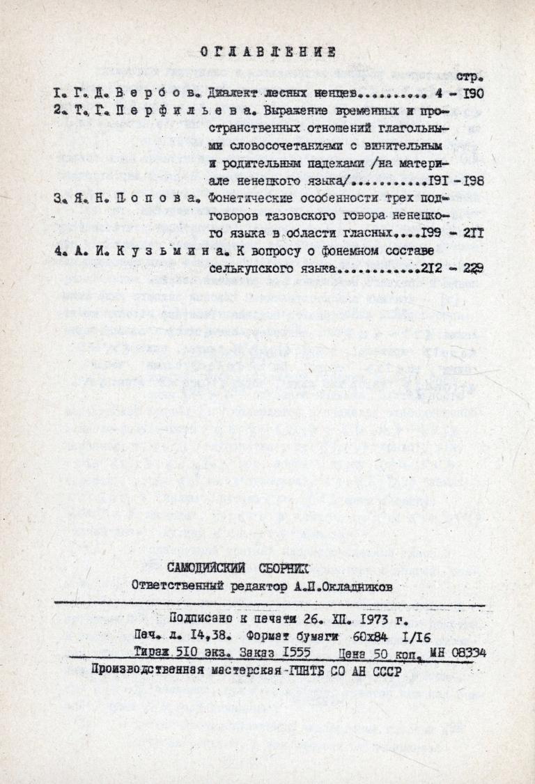 Самодийский сборник : сборник научных трудов / Академия наук СССР, Сибирское отделение, Институт истории, филологии и философии ; [редколлегия А. П. Окладников (ответственный редактор) и др.]. - Новосибирск[б. и.], 1973. - 229, [1] с.