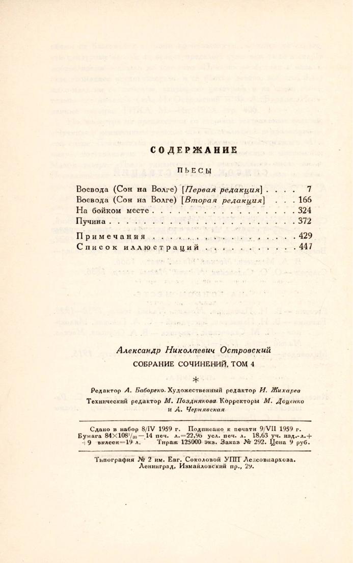 Собрание сочинений : в 10-ти томах / А. Н. Островский ; под общей редакцией: Г. И. Владыкина, А. И. Ревякина, В. А. Филиппова. - Москва : Гослитиздат, 1959- . Т. 4: Пьесы. 1865-1866. - 1959. - 448 с., 9 л. ил.